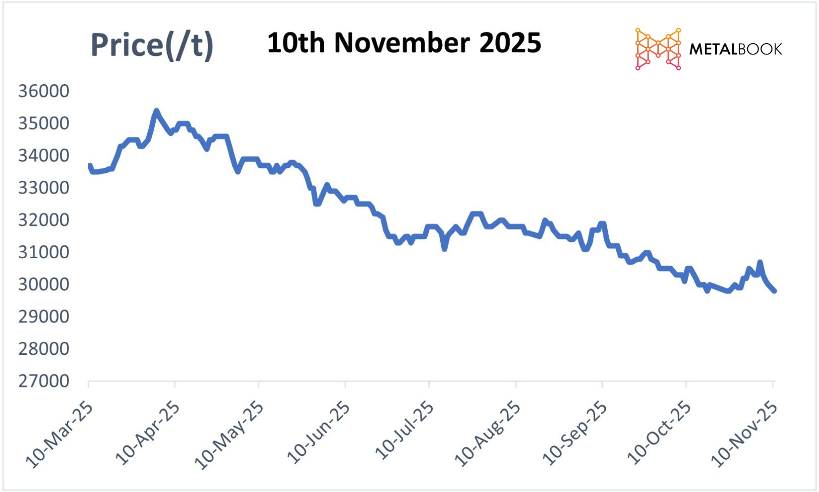 On the 10th of November 2025, ship-breaking melting scrap prices fell by ₹200 per tonne in Gujarat’s Alang market. HMS (80:20) was priced at approximately ₹29,800 per tonne ($336/t) ex-yard. Limited trade activity in the region for semi-finished and finished steel products has created bearish sentiment in the market.