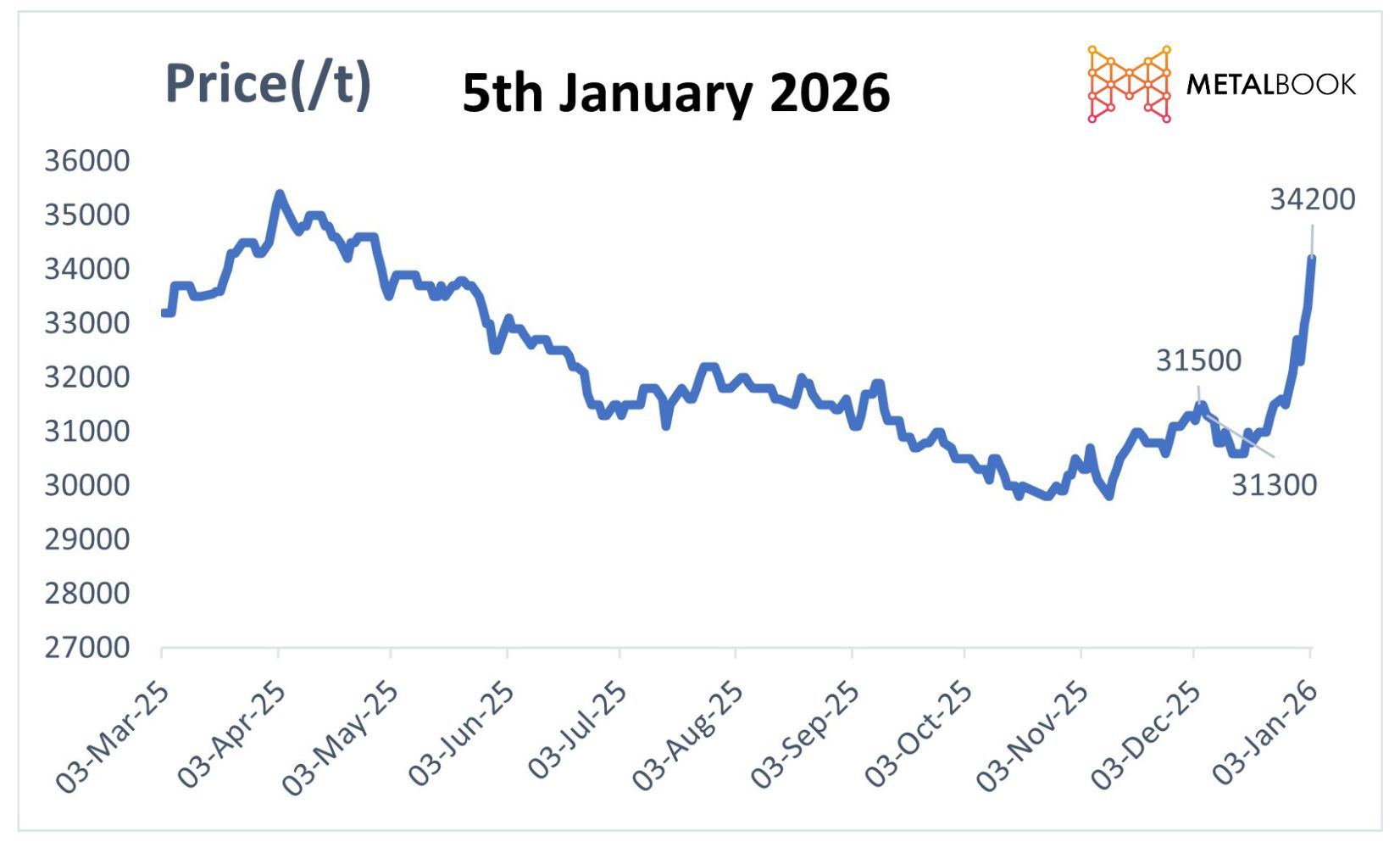Alang’s ship-breaking melting scrap prices has increased by ₹900/t day-on-day on 3 January 2026, with HMS (80:20) assessed at ₹34,200/t. The increase in price is owing to improved trading activity in the regional steel market, as semi-finished and finished steel prices gained ₹1,100–1,600/t. With the current strong mill buying interest and better steel realizations has encouraged scrap suppliers to revise offers upward, tightening availability in the market.