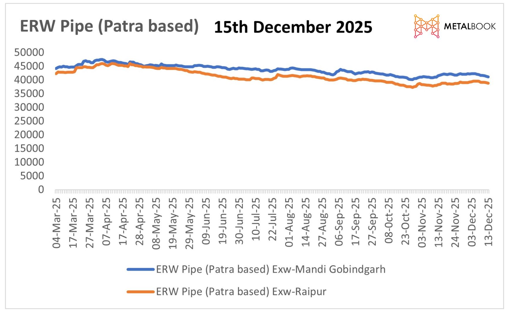 It has been anticipated that the near-term prices for ERW pipe should remain volatile, and most likely a downward trend due to weak end-user demand being the significant driver over market fundamentals. With raw material prices (i.e., HR Strip, Billet) declining recently, price stability will not be supported by lower production costs - for now, it will only serve to put downward pressure on prices. Unless there is a considerable increase in finished goods demand or restocking activity, prices in both Raipur and Mandi Gobindgarh will likely remain under pressure through December, as the market remains cautious and continues to buy on a need basis.