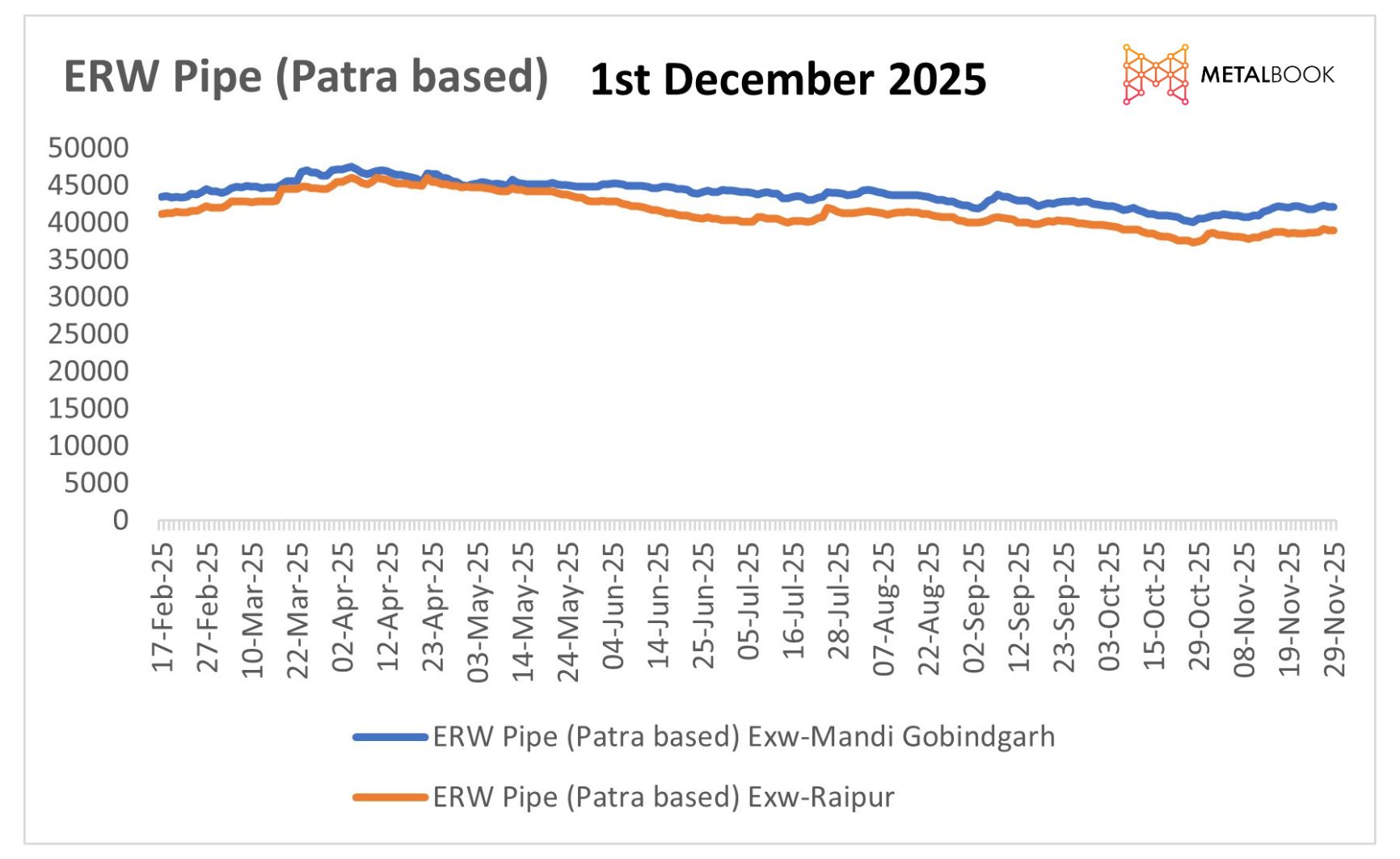 ERW Patra Pipe prices have shown a mixed trend during the week in regions like Raipur and Mandi Gobindgarh. Prices at Raipur had increased by ₹500 per tonne, standing at ₹ 39,000 per tonne. Higher billet and HR strip prices supported the prices despite overall weak steel demand. On the other hand, the prices at Mandi Gobindgarh witnessed a marginal fall on a weekly basis by ₹100 per tonne to ₹42,000 per tonne amid low trading activities and limited demand. However, daily prices had witnessed a fall of ₹200 per tonne on Friday, which reflects market volatility and cautious buying sentiments. Increases in Billet and HR strip prices will continue to put pressure on an overall rise in value; however, constrained demand did not allow prices to uniformly increase across different geographic locations.