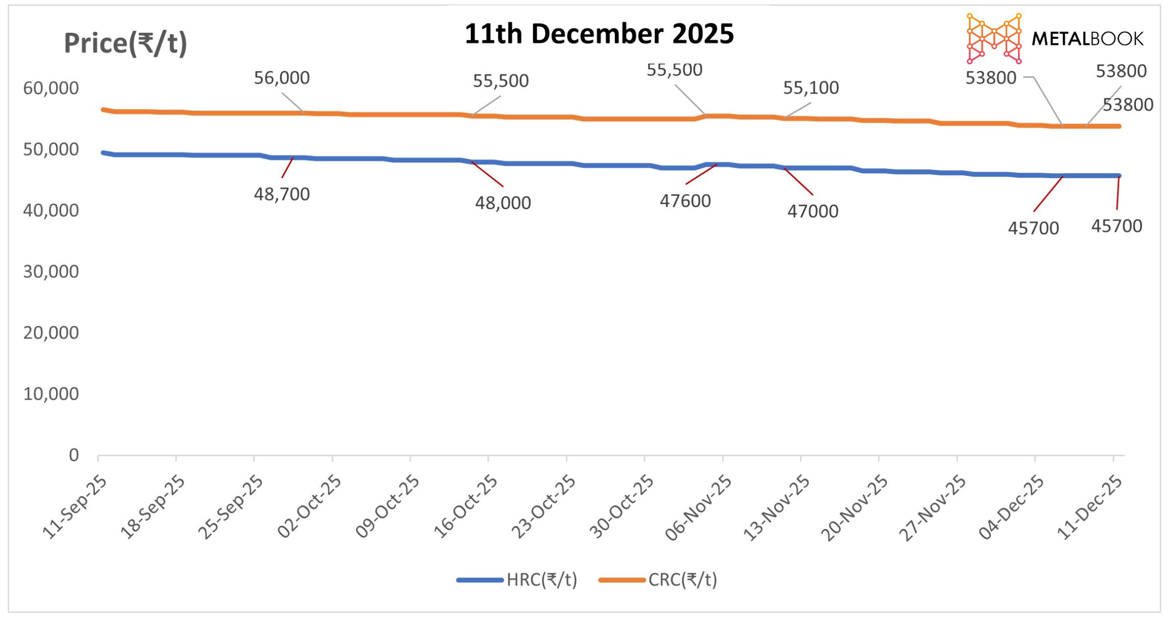 Flat steel products prices have stayed relatively steady, with HRC (hot-rolled coil) at approximately ₹45,500 - ₹47,600/ton and CRC (cold-rolled coil) in the range of ₹50,500 - ₹55,300/ton. Prices across primary markets have shown only slight declines (approximately ₹100 for HRC and ₹200 for CRC per ton); demand for these products in India remains strong, and mills are sourcing for immediate supply requirements, resulting in limited variation from spot buying levels at the distributor level.