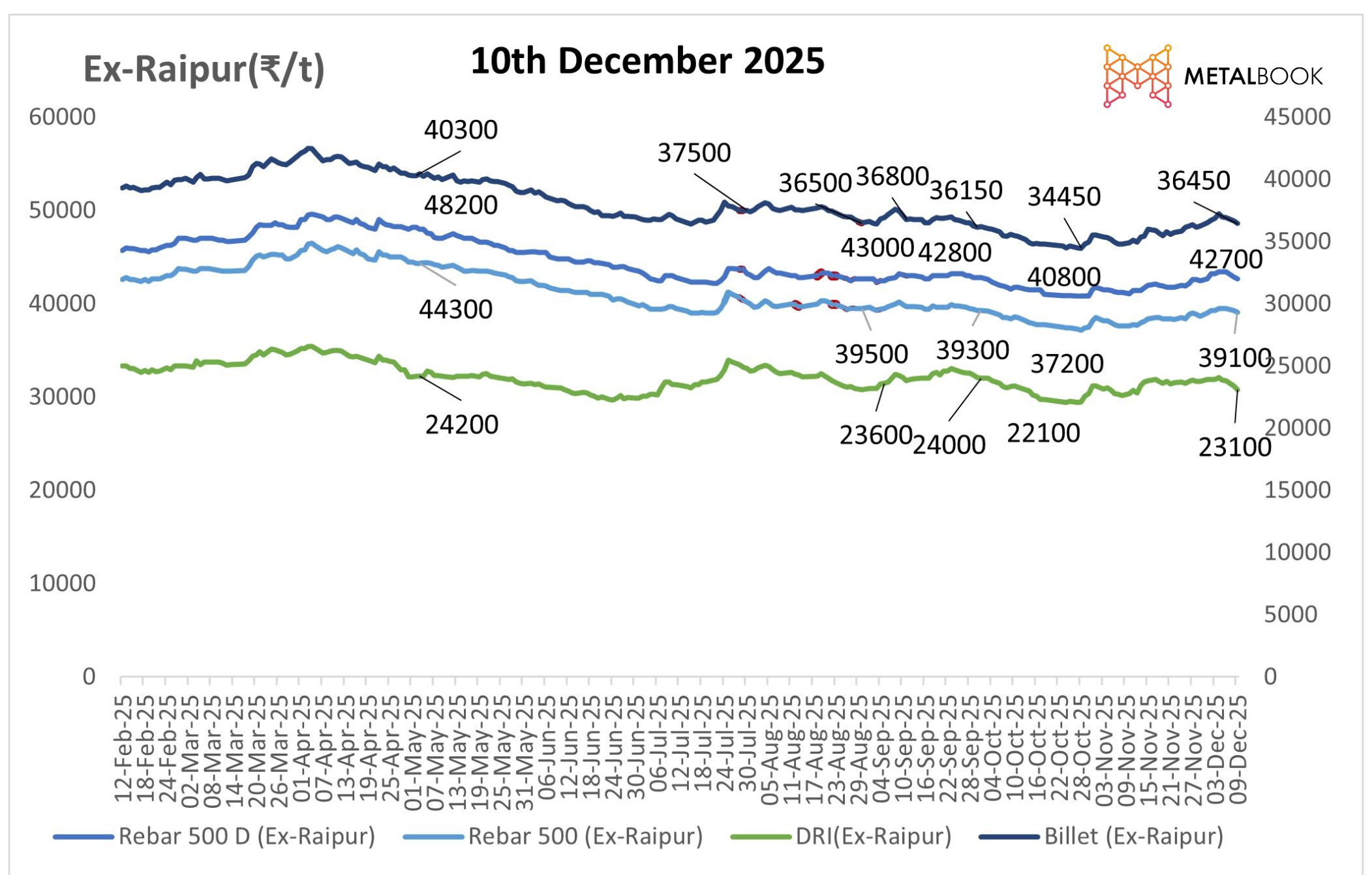 India’s IF steel market showed weak activity due to limited buying inquiries in finished steel, which had kept the overall market sentiment subdued. Rebar prices have also declined by ₹200 on a d-o-d basis. Sponge iron prices dipped marginally by ₹50–300/t, led by Raipur with a sharp fall of ₹300/t to ₹23,100/t. Billet prices also declined by ₹100–500/t across regions, with the steepest fall in Hyderabad to ₹38,000/t. Rebar (Fe 500) prices slipped by ₹100–200/t in most markets, particularly in Raipur, Durgapur, and Jalna, while Mumbai was the only region to register a minor ₹100/t rise. The recent slump in orders for finished steel and decreased interest from end-users in stocking products have dampened activity within the steel market, causing buyers to remain cautious on new purchases and place very few inquiries into the spot market.