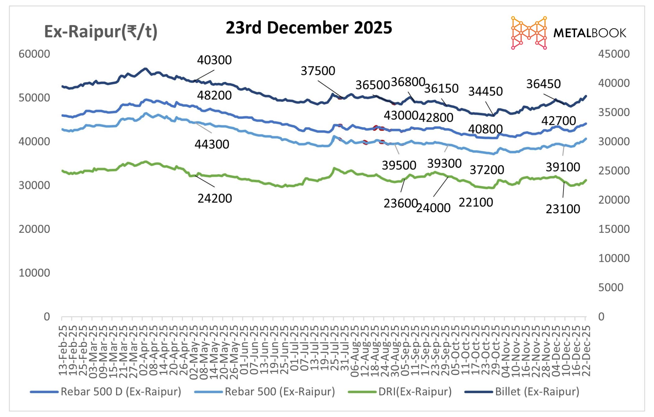 India’s induction furnace steel prices have moved up marginally as the sellers had hiked the prices amid steady bookings last week. Sponge iron prices have risen by ₹50-550/t d-o-d basis, with Raipur witnessing the steepest increase of ₹550/t to ₹23,400/t. Billet prices have risen by ₹300-₹1000/t across markets, led by a ₹1000/t rise in Hyderabad to ₹39,500/t. Rebar prices continue to trend higher today with increases ranging from ₹200–₹800/t depending on geographic location, with Raigarh's location having the largest increase at ₹800/t to ₹40,400/t. Overall, the combination of improved market demand and strong buying interest has contributed positively to the strong level of trade activity in the market today, which prompted steel mills to raise their offers.