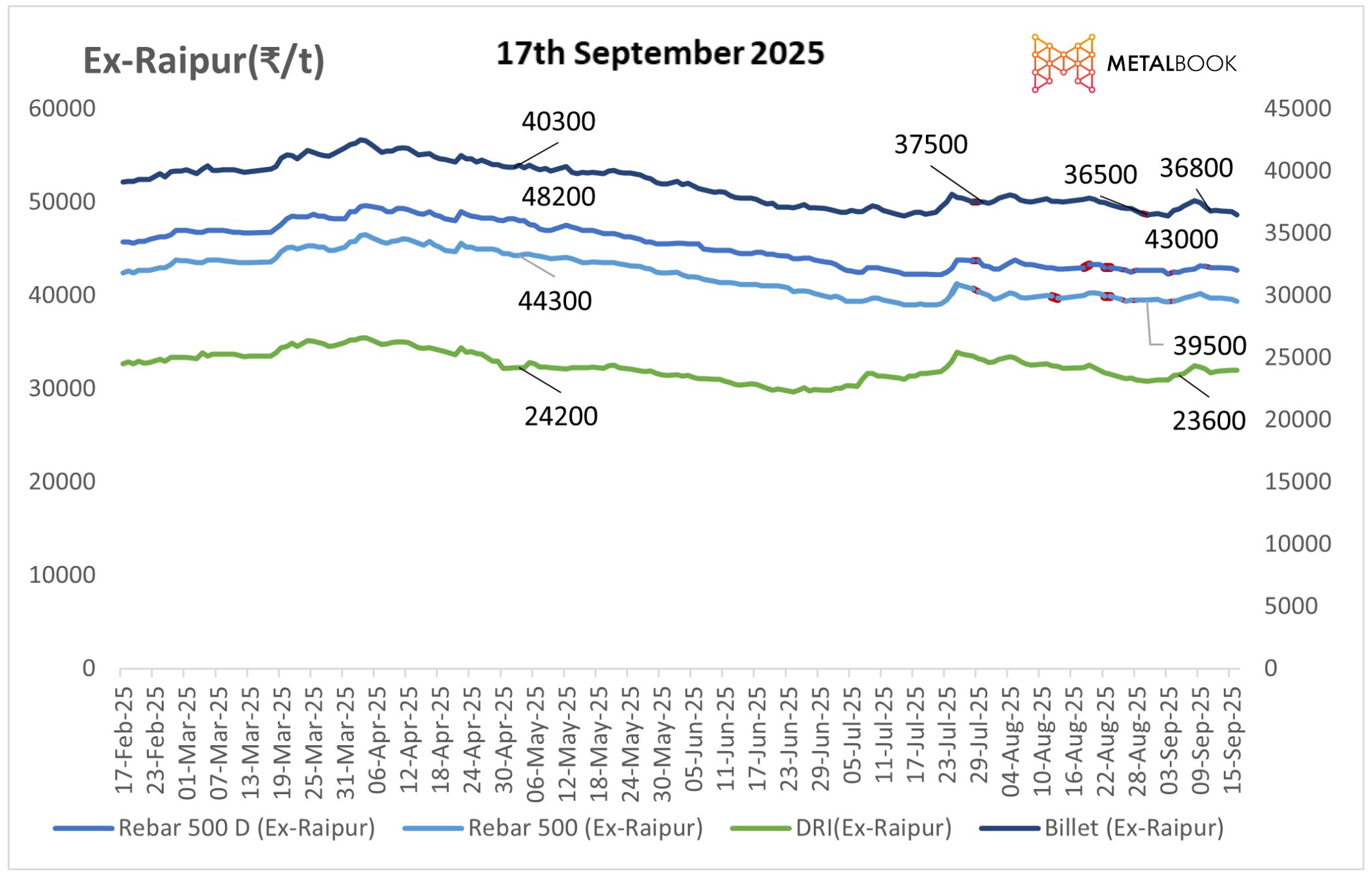 India’s induction furnace (IF) steel market witnessed continued price corrections today due to weak demand and fluctuating raw material costs. Rebar (Fe 500) offers declined by ₹100–₹300/tonne, except Mumbai, where local demand saw a slight increase, adding ₹100/tonne. Rebar price ex-Raipur was assessed at ₹39400 as on 17th September 2025.