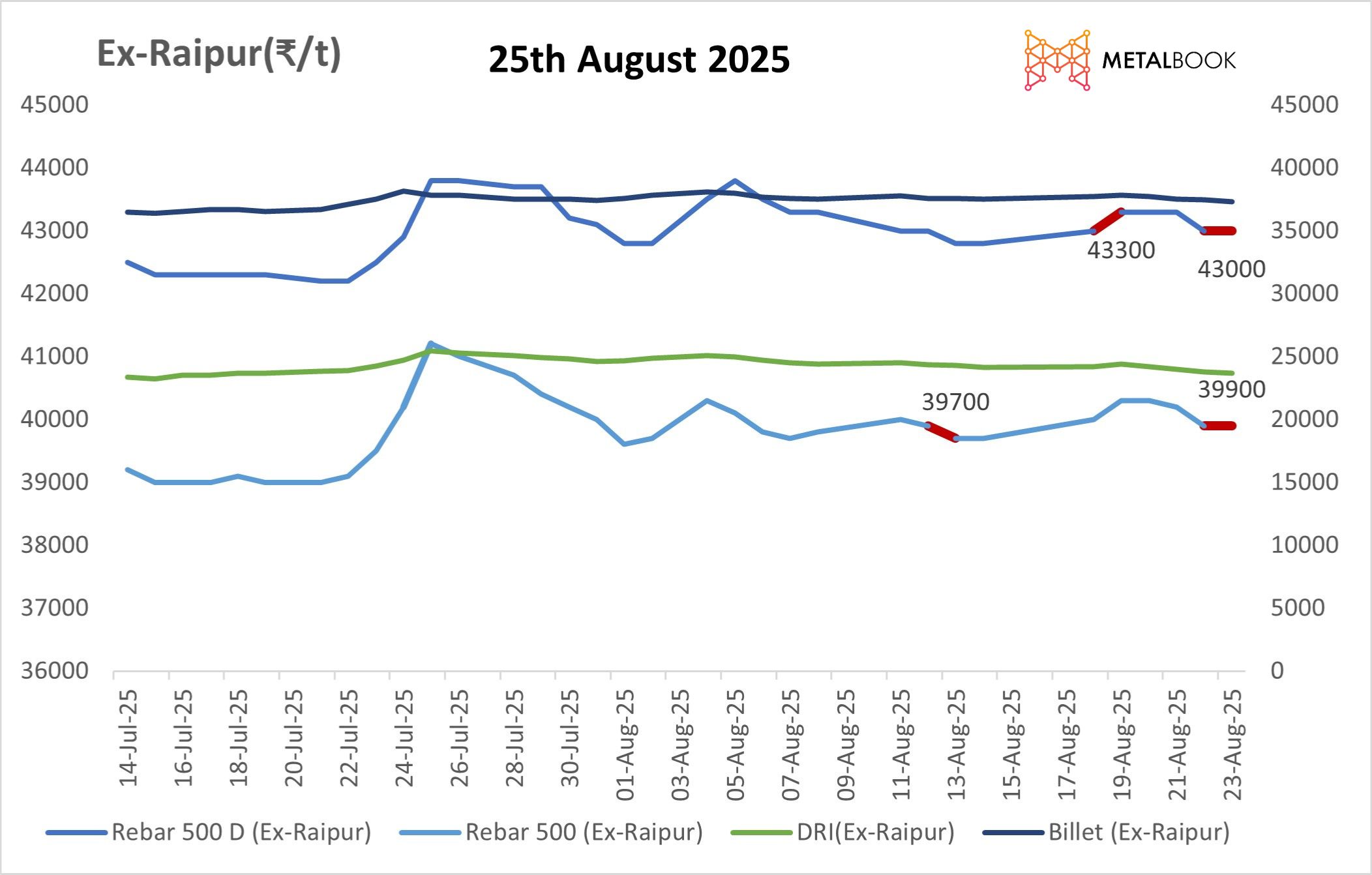 India's IF route finish long steel is still seen under pressure this week. Deteriorating inquiries, sluggish construction activity, and uncertain raw material pricing, particularly in sponge iron and billets, have led to low booking volumes. Few bookings were seen, but those were only from buyers who needed it on an immediate basis. Most regions reported declines of ₹100–1,000/t on a weekly basis. However, Raipur stood out as an exception, where despite the overall downtrend, prices inched up by ₹ 200/t on a weekly basis, even though they had earlier dropped by ₹500/t mid-week before rebounding slightly toward the weekend. The price movement in Raipur is the combination of localized demand and short-term supply tightness, though overall market sentiment remained cautious. Rebar Prices for Fe 500 grade were assessed between ₹39,700–40,100/t ex-works Raipur and ₹43,200–43,800/t ex-works Jalna.