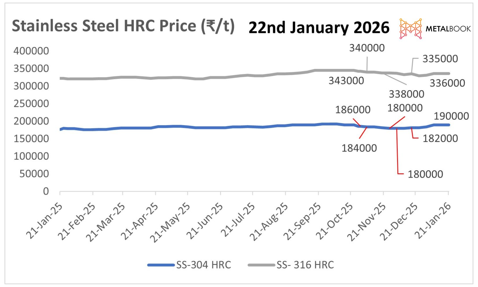 Stainless steel prices in India remained firm during this period, supported by a strong US dollar and higher global prices, and rising raw material and alloy costs. SS 304 hot-rolled coils (HRCs) were assessed at ₹190,000/t ex-Mumbai, while 316 HRCs stood at ₹ 336,000/t, both steady w-o-w basis.