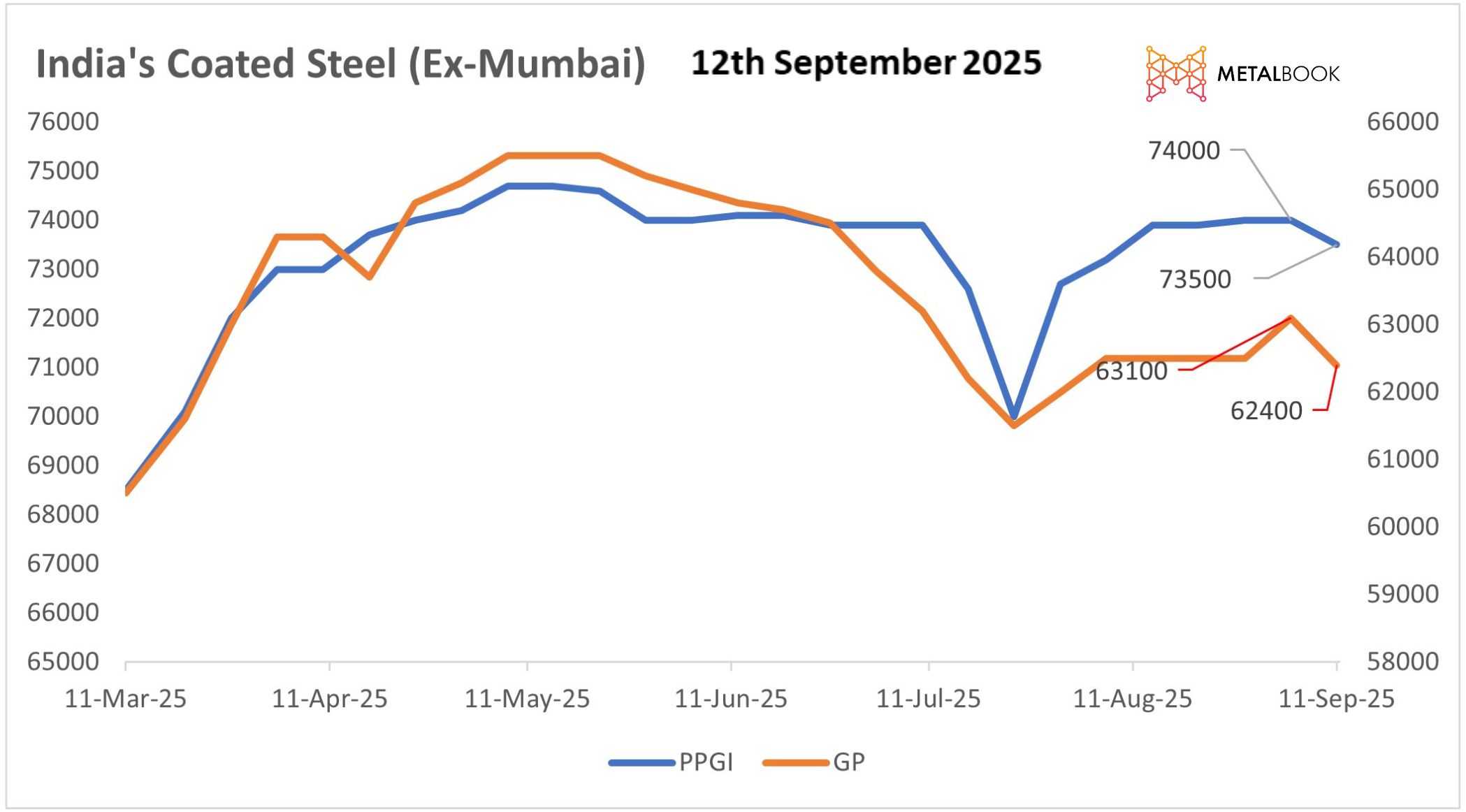 India's coated flat steel market continues to face considerable headwinds as price pressure from weak demand, high inventories, and seasonal holdups remains. The prices of GP were assessed at ₹62,400/t and PPGI at ₹73,500/t, which dropped by ₹700/t and ₹500/t, respectively, due to a lack of buying momentum from across regions compared to last week.