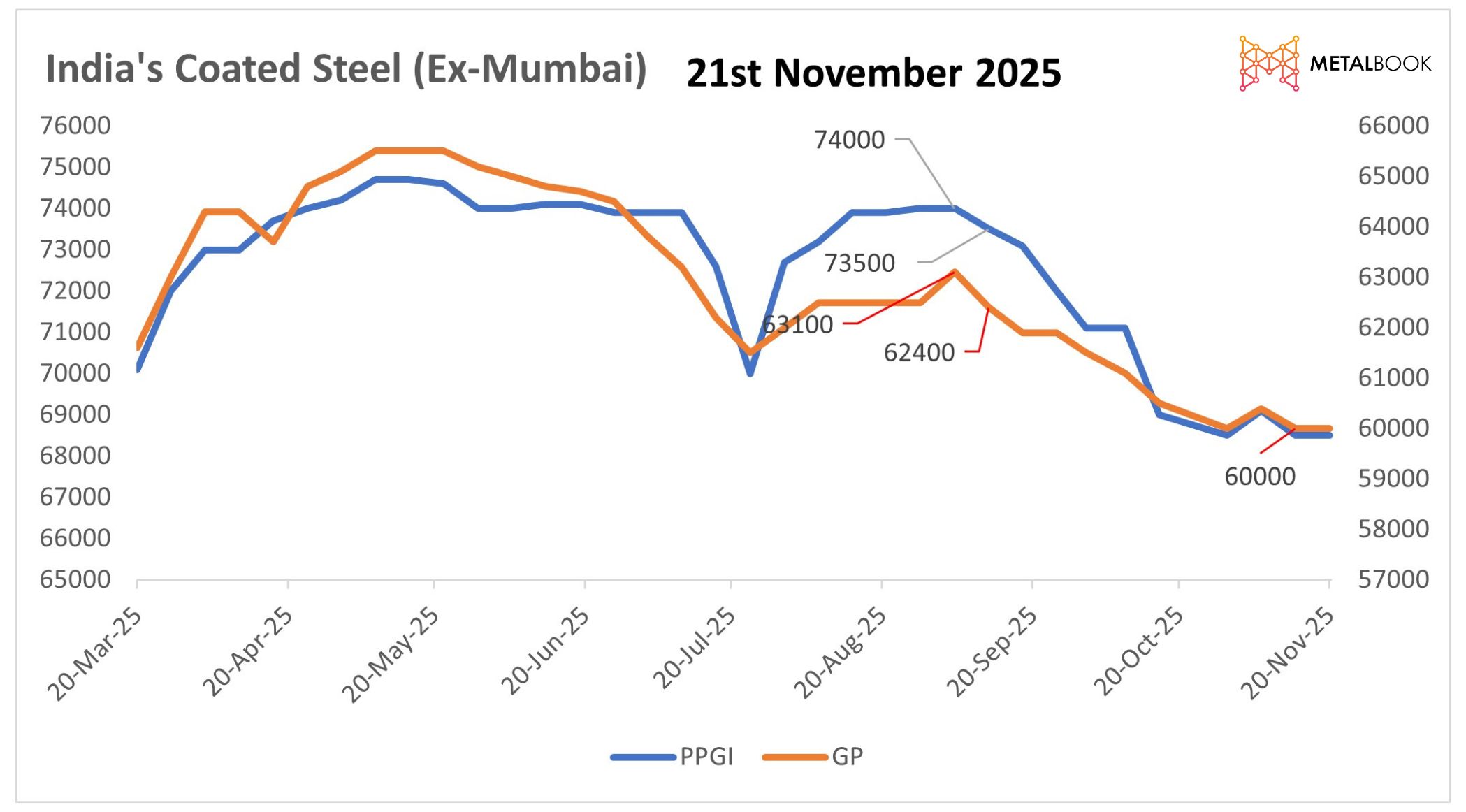 Going forward, coated flat steel prices are expected to remain relatively stable in the short term, as demand across regions continues to be subdued. GP may see steady inquiries, while PPGI and galvalume segments may continue to remain pressured by delayed buying and weak downstream consumption. There are no clear signs of improvement in market sentiments, and trading is expected to remain need-based until either liquidity conditions change or a mill's offer is lower enough to attract a booking.