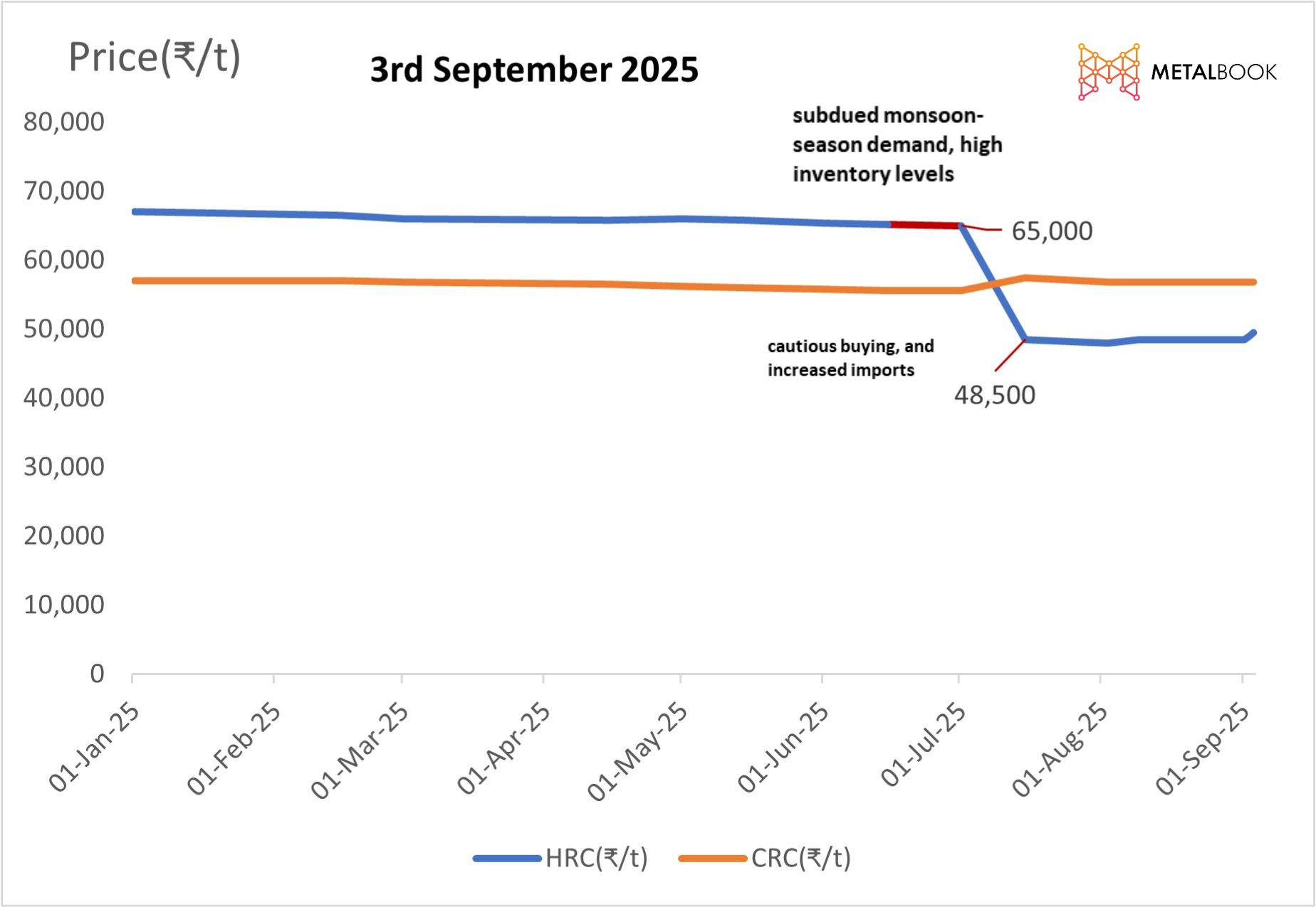 The prices of HRC and CRC steel in Mumbai varied significantly from July to September due to seasonal, economic, and global events. The sharp decline in HRC prices was observed amid subdued monsoon-season demand, elevated inventories, liquidity constraints, and increased imports, all of which were pressuring the domestic market. The impact of the monsoon season created conditions that slowed construction activity, which led to a decrease in demand. Furthermore, industrial buyers were cautious and delayed orders due to higher inventories and expectations of price reductions. Finally, high steel imports from across the globe (China, South Korea, and Japan) put downward pressure on domestic pricing by creating competition.