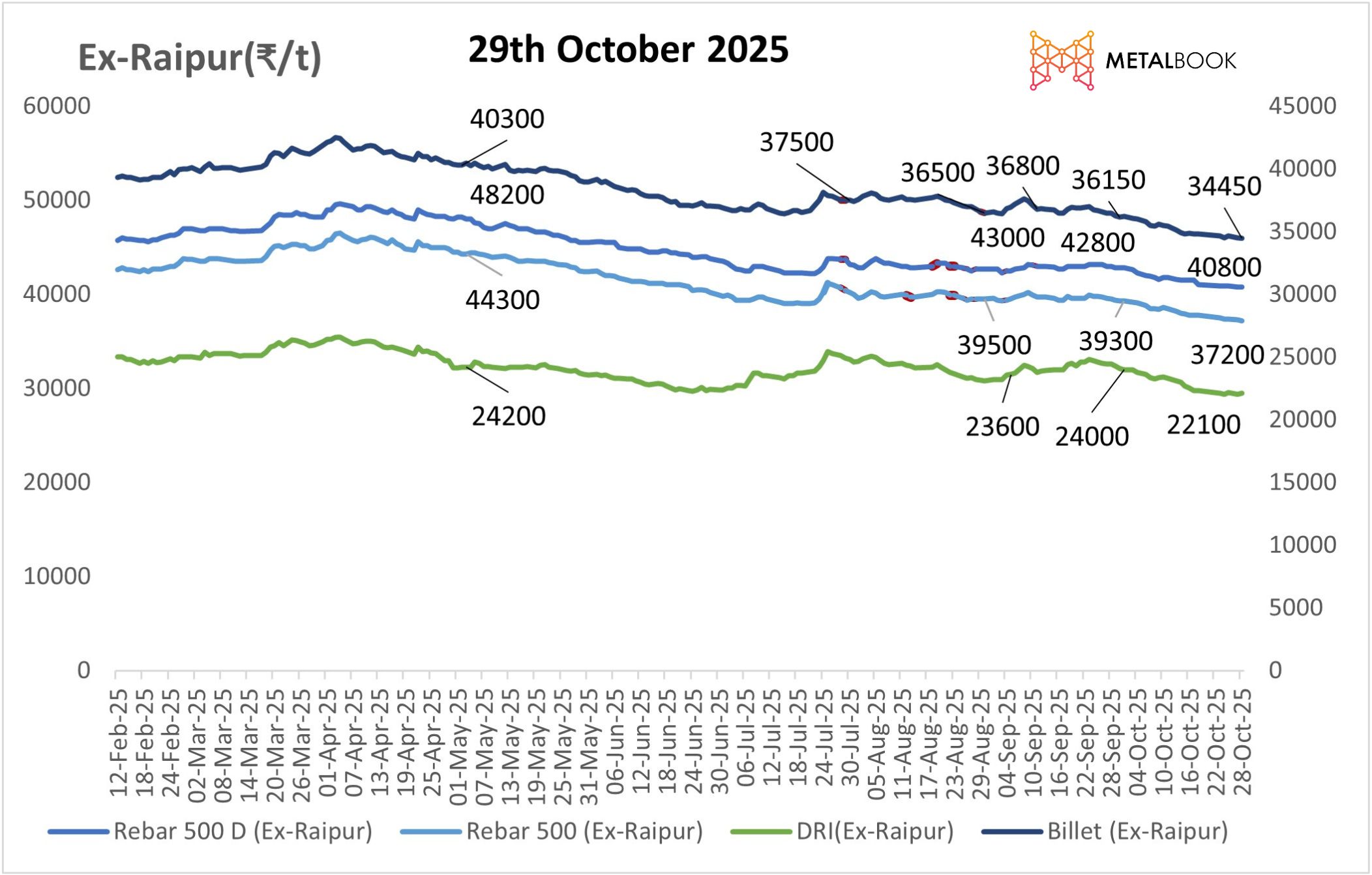 The Indian induction furnace (IF) steel sector continued to be soft as prices ticked down in most regions, in part due to cautious market sentiments and elevated inventory. Sponge iron prices decreased ₹100–250/t on a day-on-day basis in various regions, like in Durgapur, while Raipur increased modestly by ₹50/t. As for the billets, prices decreased ₹50–200/t with the largest drop of the day occurring in Durgapur, Ramgarh, Chennai, and Ahmedabad, while Mandi managed to tick up ₹50/t. Pricing for rebars (Fe 500) dropped ₹100–200/t with Mandi decreasing the most, down ₹200/t.