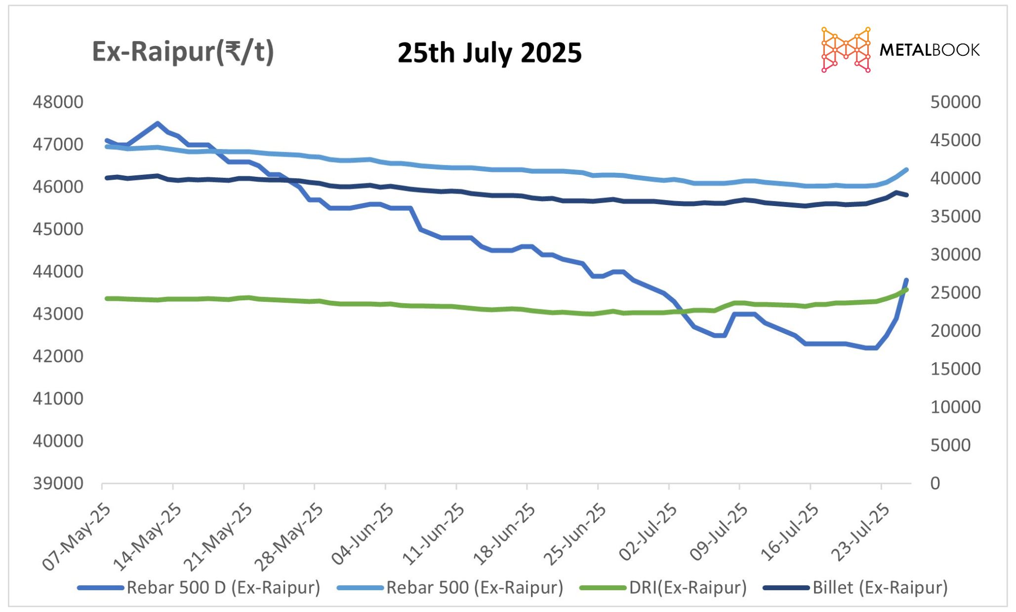 Towards the end of the week, demand picked up, especially for semi-finished and finished steel products, leading to significant price increases. The billet prices rose by up to INR 800/tonne and rebar by INR 400/tonne in a few key markets. This rebound in prices is supported by a rise in sponge iron prices, notably in central and eastern India.