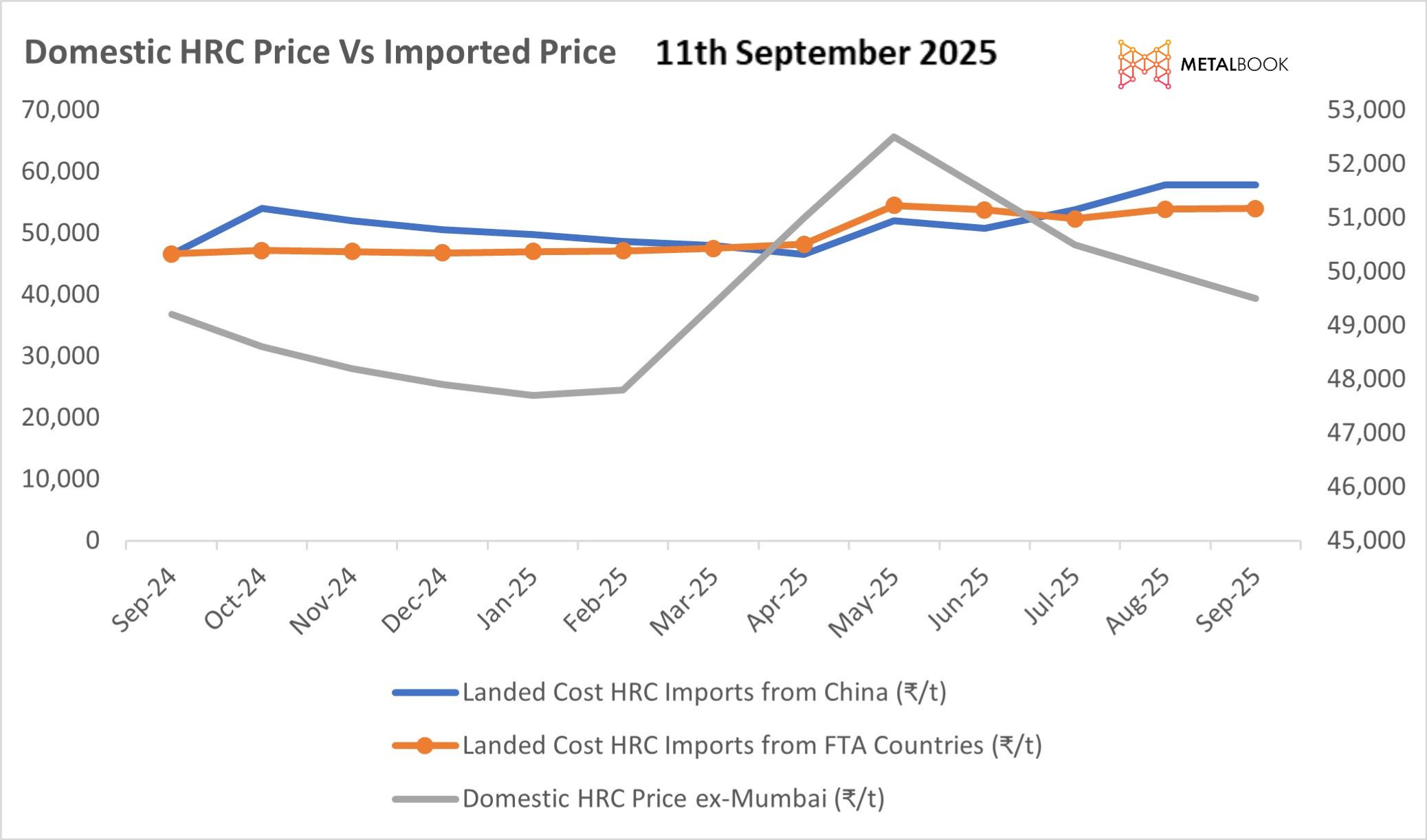 However, the domestic HRC prices remained more competitive at ₹49,500/t /t (ex-Mumbai, excluding GST). The ongoing government support through various policy measures is beneficial for domestic producers. The safeguard duty of 12% (plus cess) that applies to imports below a threshold of $675/t has rendered imports relatively less attractive and resulted in a 37% year-over-year reduction in HRC imports in August 2025. South Korea, China, and Japan continued to supply HRC.