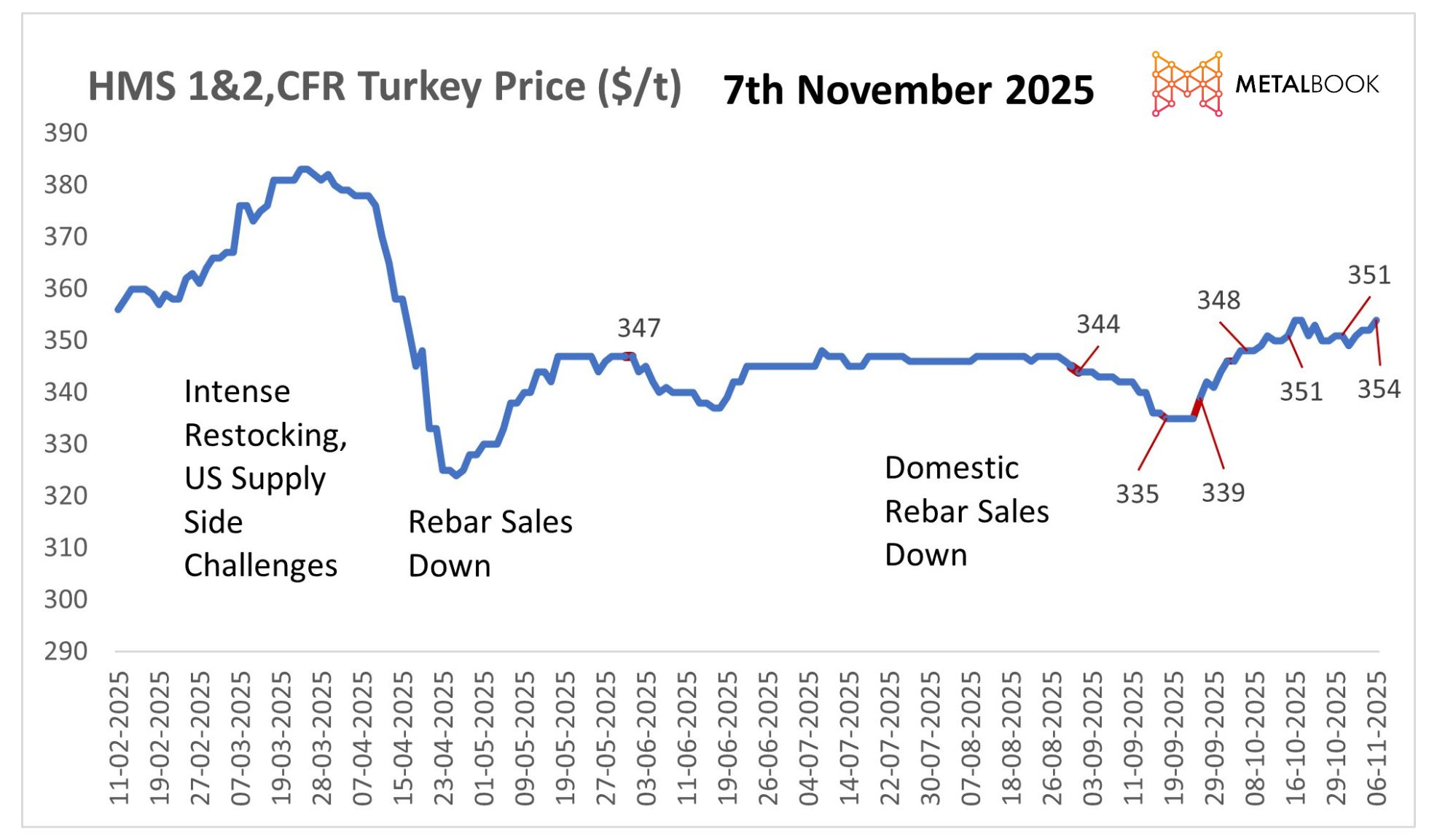 The cost of deep-sea imports of ferrous scrap in Turkey moved up around $3/tonne week-on-week, lifted from a new US deal and strong local mill demand. About 5-6 cargoes traded in the $345-$356/t CFR range. Bulk HMS 80:20 from the US traded for $354/t CFR. The limit of Europe's supply and approximately $45/t freight charge to Turkey from the US reduced availability and supported strong offers. On the other hand, the Turkish scrap-to-rebar spread continued to remain stable on the week at $190-195/t, while rebar offers were seen in the range of $540-545/t FOB, showing that margins for the mills were balanced despite a lack of finished steel exports.