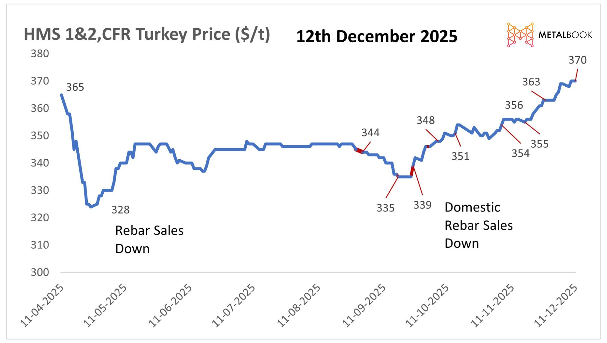 The Turkish scrap market is exhibiting steady strength and has maintained its HMS 1/2 80:20 price level of around $370/t CFR today, which is higher than the April 2025 levels for Turkey. This stability persists despite weak rebar demand and lower building activity in Turkey. The ongoing tightness of scrap, combined with the high shipping costs for beverage shipments to Turkey from the US and Europe earlier this week, continues to bolster market sentiment. Mills are actively trying to procure scrap to fulfill their January and early February orders; however, they are limited in their ability to procure scrap due to the shortened December buying period and, therefore, are in a better position than previously due to limited margins.