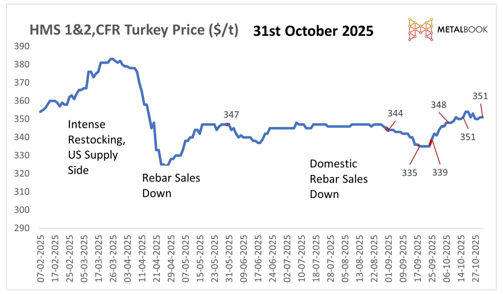 This week, Turkish imported deep-sea HMS 80:20 scrap prices were stable at approximately $351/t CFR, unaltered from week-ago values, with very limited activity and only one or two cargoes booked as mills adopted a wait-and-see approach with depressed rebar demand and high freight rates. Most Turkish steelmakers had already bought scrap for delivery through the end of November, as the timing of the national holidays further reduced activity. Weaker steel consumption, particularly in the domestic and export rebar market, limited mills' interest in new scrap purchases. Additionally, recent upswings in freight rates, which have spiked from roughly $25/t to $35/t over the past month, were a negative factor on import margins that kept buyers cautious.