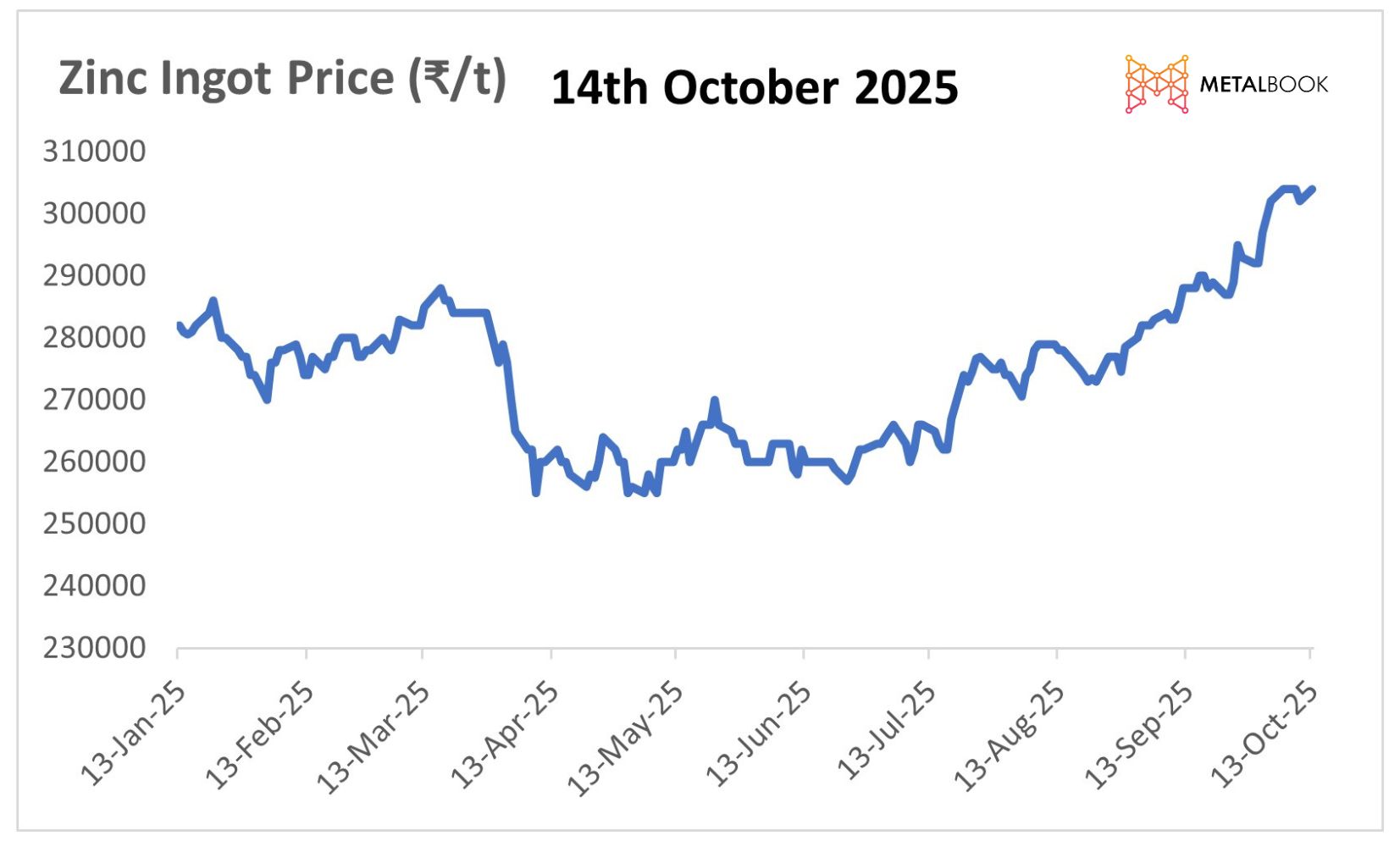 Zinc prices in India have continued their strong upward momentum through October 2025, supported by tight global supply, declining LME inventories, and rising import costs. Hindustan Zinc Limited (HZL), India’s largest producer of refined zinc, has revised its ingot prices upward twice this month in response to international trends. On 1 October, HZL priced zinc ingots at ₹311,700/t. Following two consecutive increases, including a ₹2,800/t hike on 13 October, the price now stands at ₹320,400/t (~$3,609/t) ex-Chanderiya. This adjustment reflects the recent surge in LME zinc, which has risen to $3,018/t in recent weeks due to a sharp decline in LME zinc inventories (over 60% down year-over-year), logistics issues, and robust premiums in the physical market. In India, SHG (Special High Grade) in places such as Delhi and Mumbai have climbed to ₹295,000–305,000/t as traders and end-users attempted to buy material at a time when imports were limited and there was little opportunity to access overseas branded zinc subject to BIS certification.